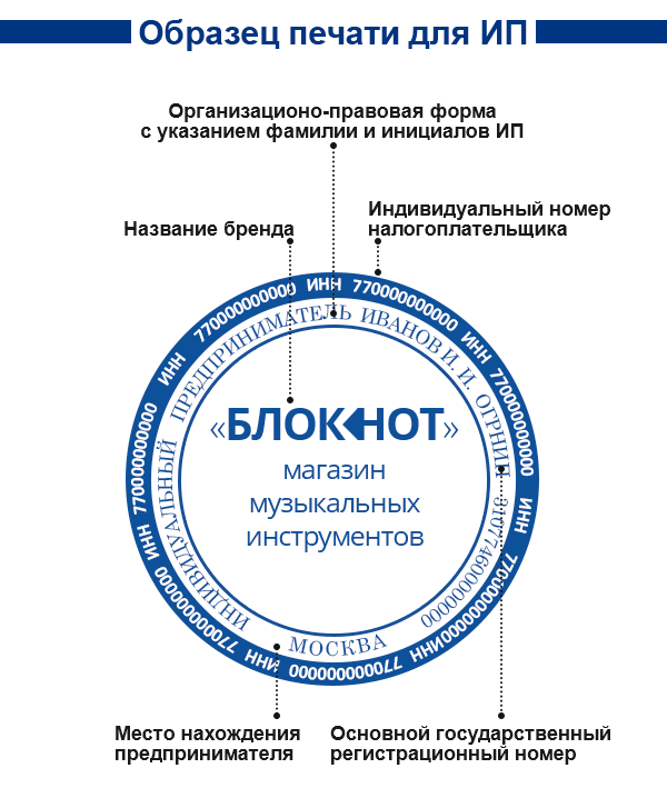 Во-вторых, на клише указывают сведения, необходимые для идентификации субъекта предпринимательской деятельности. Для ИП это полное имя физического лица, его ИНН и ОГРНИП. Также здесь указывают город жительства или место деятельности предпринимателя. Если предприниматель работает под знаком обслуживания или имеет логотип, то их тоже размещают на печати.