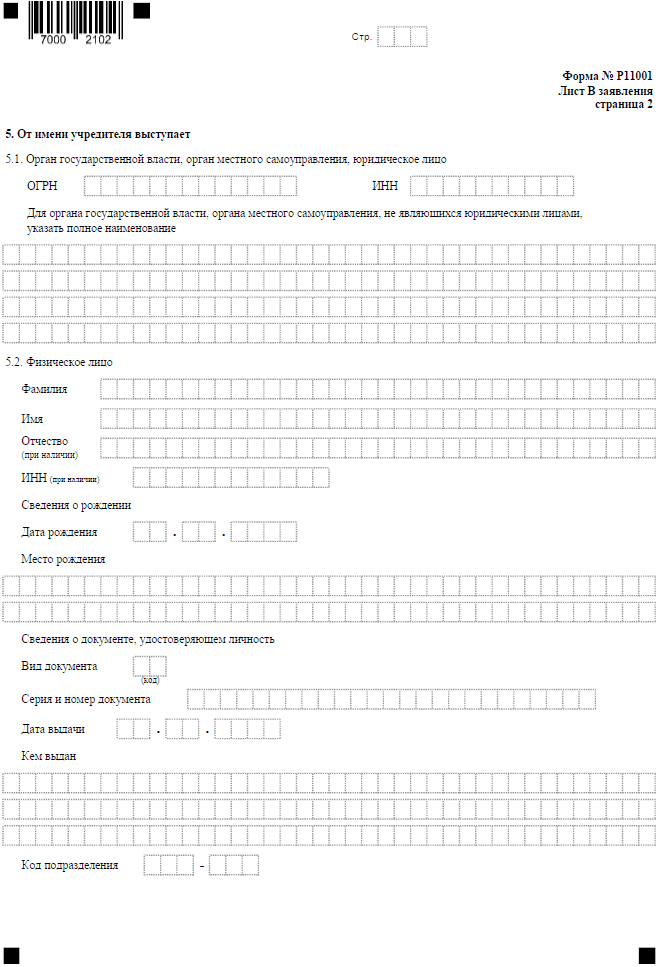 Причем на первой странице надо указать код субъекта РФ или наименование муниципального образования. А на второй странице вносят данные того, кто выступает от имени учредителя. Это может быть орган государственной власти, юридическое или физическое лицо.