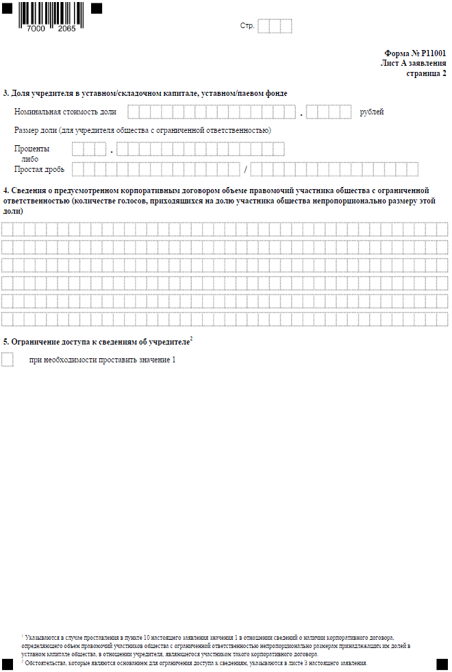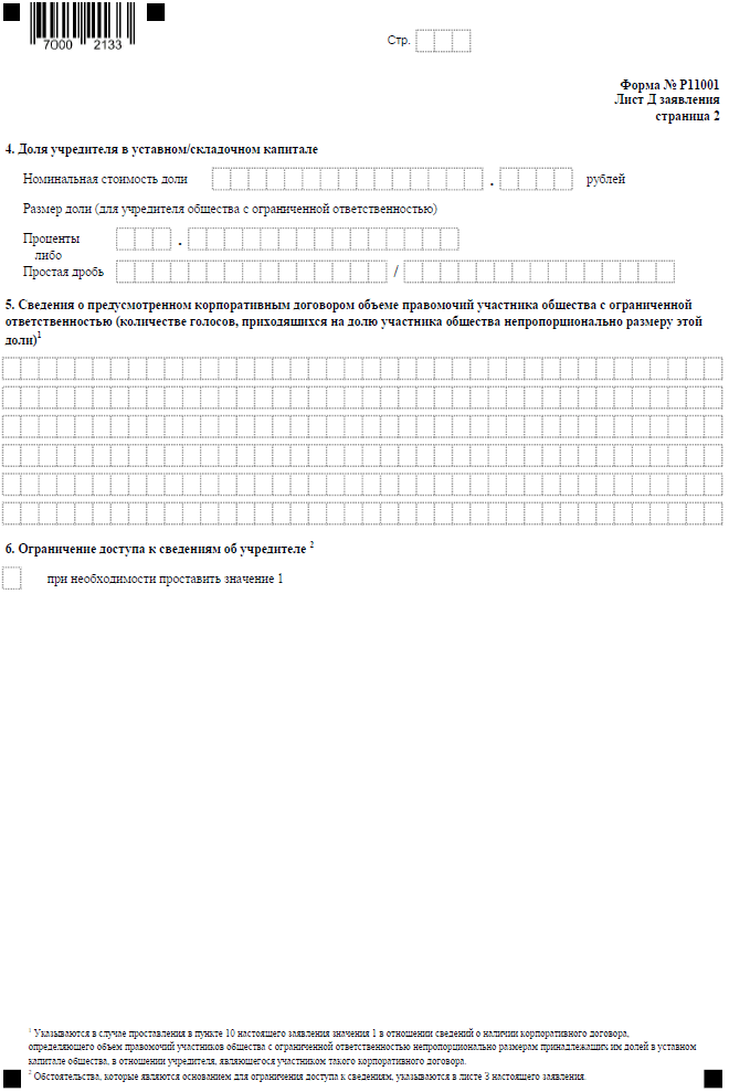 Следующие пять листов заявления по форме Р11001 предназначены для указания сведений об учредителях общества с ограниченной ответственностью.