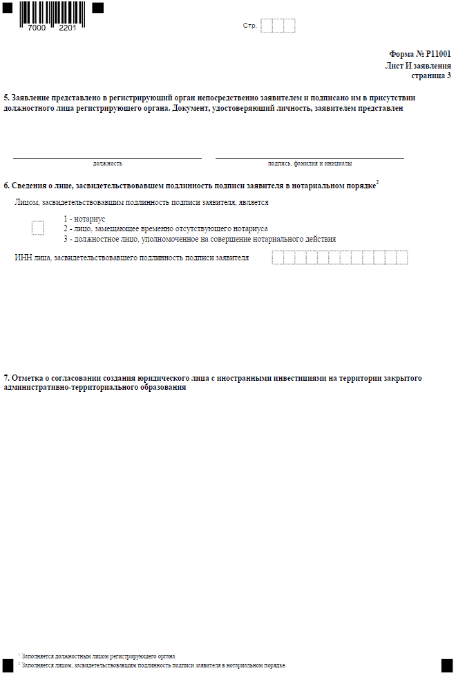 Последний важный нюанс: третья страница листа И не заполняется заявителем, однако в отношении нее сделано исключение. Несмотря на то, что она не заполнена, ее надо включить в заявление Р11001 и пронумеровать. На ней свою отметку проставит сотрудник ИФНС или нотариус.