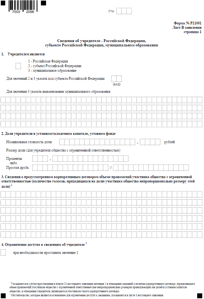 В некоторых случаях открытие ООО осуществляется с участием РФ, региона или муниципального образования. Для таких учредителей заполняется лист В.